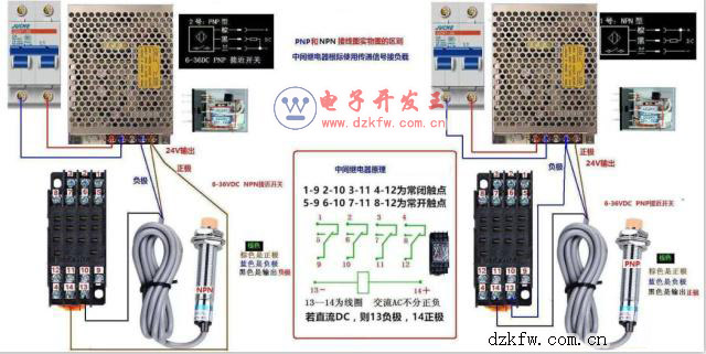 我們繼續(xù)看右圖,電源進(jìn)開(kāi)關(guān)電源,經(jīng)過(guò)開(kāi)關(guān)電源變壓,整流,輸出為直流24V,負(fù)極接接近開(kāi)關(guān)藍(lán)色,同時(shí)并聯(lián)到繼電器線圈13。正極接接近開(kāi)關(guān)棕色線,黑色線進(jìn)繼電器線圈14。這里重點(diǎn)說(shuō)明,接近開(kāi)關(guān)。棕色----正極 藍(lán)色---負(fù)極 黑色輸出正極。工作原理當(dāng)物體靠近接近開(kāi)關(guān),觸點(diǎn)閉合接近開(kāi)關(guān)輸出正極,由于負(fù)極直接進(jìn)繼電器,所以繼電器得電工作。停止:當(dāng)物體離開(kāi)接近開(kāi)關(guān),接近開(kāi)關(guān)觸點(diǎn)斷開(kāi),停止輸出正極,繼電器失電停止工作。