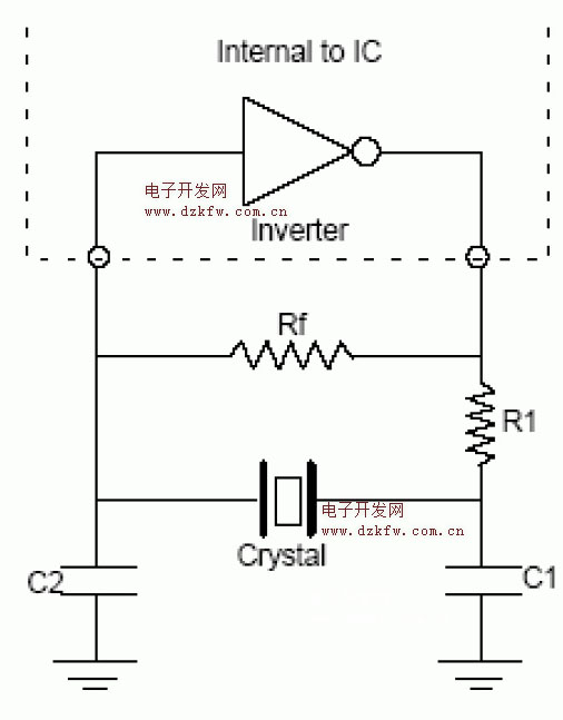 一些芯片內(nèi)置了這些外部器件(Rf,R1,C1,C2),因此消除了電路設(shè)計師的煩惱。這種情況下,只要把晶振連接在XTAL引腳上即可。