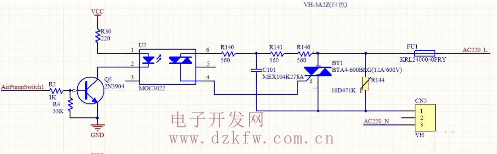 簡單介紹一下,Q5是三極管,U2是個光耦,BT1就是雙向可控硅,R144是一個壓敏電阻,正常工作時候相當于斷路,超過470V才起作用,CN5接負載,也就是說我只要給AirPumpSwitch一個信號,可控硅就是導通的了,不管是在交流電正負部分。