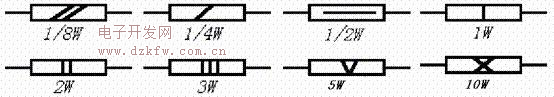 電阻器的正常工作不致于燒壞的功率為額定功率,電阻器工作時實際消耗的功率是消耗功率,它常常只有額定功率的1/2或稍大一點。電阻器額定功率分19個等級,常用的有0.05W、0.125W、0.25 W、0.5 W、1 W、2 W、3 W、5 W、7 W、10 W,在電路圖中非線繞電阻器額定功率的符號表示如下圖: