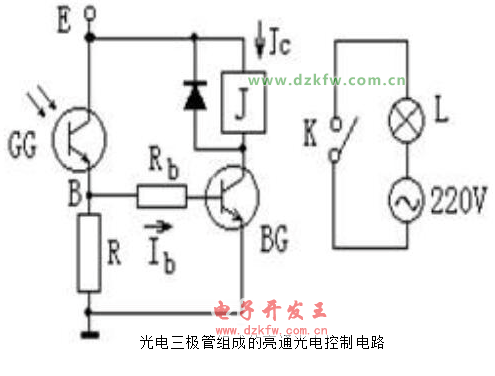 當有光線照射于光電器件上時,使繼電器有足夠的電流而動作,這種電路稱為亮通光電控制電路,也叫明通控制電路。最簡單的亮通電路如圖所示。