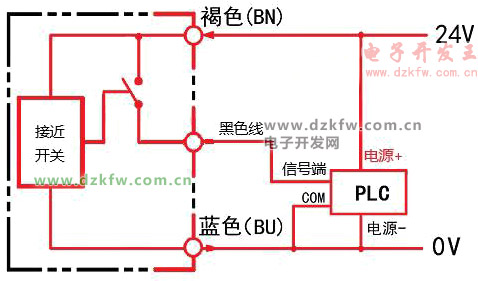 它們的接線方法是棕色線接PLC直流電源24V“+”端子,藍色線接PLC的0V端子,黑色線接PLC相應的輸入端子,如下圖所示。對于像光電式的接近開關,我們可以在它的下面放置黑色工件和白色工件,看看PLC相應的輸入端子有沒有信號。我在工作中就是通過這種辦法,不用萬用表就可以檢測接近開關了。