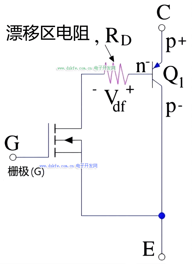 眾所周知,IGBT是 MOS 管的輸入和 BJT 的輸出的組合,它具有與N溝道MOS管和達林頓配置的PNP BJT等效的結構,因此也可以加入漂移區的電阻。