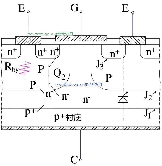 如上圖所示,最靠近集電極區的層是 (p+) 襯底,即注入區;在它上面是 N 漂移區域,包括 N 層。注入區將大部分載流子(空穴電流)從 (p+) 注入 N- 層。