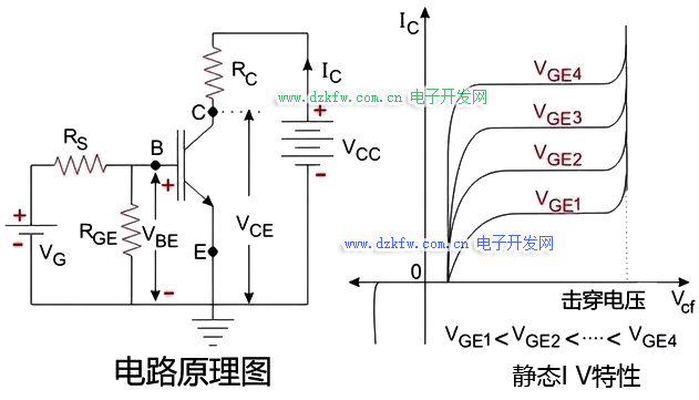 1、靜態 VI 特性下圖顯示了 n 溝道 IGBT 的靜態 VI 特性以及標有參數的電路圖,該圖與 BJT 的圖相似,只是圖中保持恒定的參數是 VGE,因為 IGBT 是電壓控制器件,而 BJT 是電流控制器件。