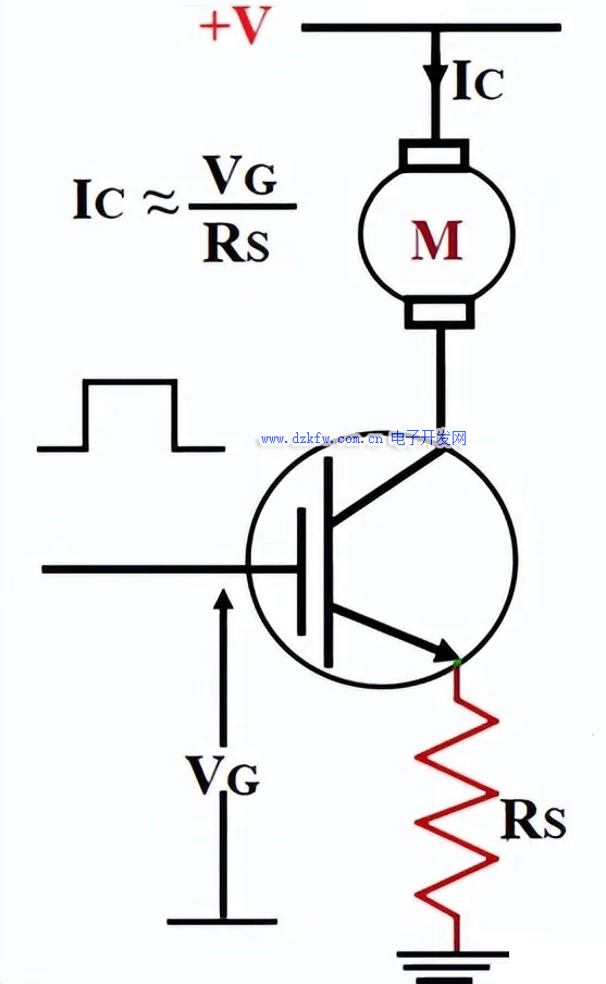 由于是單向器件, IGBT 只能在從集電極到發射極的正向切換電流。IGBT的典型開關電路如下所示,柵極電壓 VG施加到柵極引腳以從電源電壓 V+ 切換電機 (M)。電阻 Rs 大致用于限制通過電機的電流。
