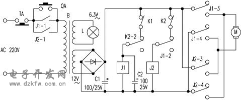 電源變壓器B、橋式整流堆和電容C1組成12V直流電源。繼電器J1、J2和行程開關K1、K2組成互鎖電源極性切換電路。