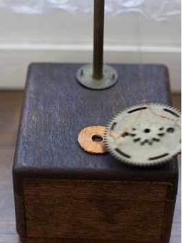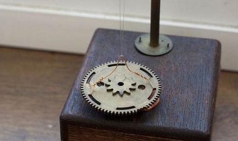 - 鐘擺是一個齒輪,底部固定有一塊磁鐵,通過細細的魚線吊在橫桿上