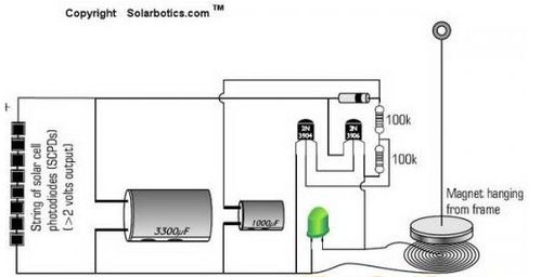 說它簡單,它僅僅由兩個三極管,兩個電阻,兩個電容,一個二極管,一塊太陽能電池,一個線圈和一塊磁鐵構成。