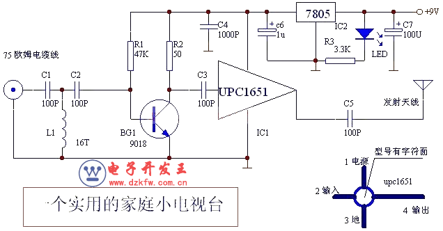 電路如圖下圖所示: 這個電路的工作原理是射頻信號經(jīng)75歐姆射頻電纜送至有C1、 L1、C2 構(gòu)成的高通濾波器,將低于45MHZ的頻率濾除,然后在經(jīng)三極管9018等組成的前置放大器放大后由電容C3送至upc1651進(jìn)行功率放大,其輸出信號經(jīng)60cm左右的鞭狀天線發(fā)射 出去。7805等構(gòu)成穩(wěn)壓與電源指示為upc1615提供5V的供電。