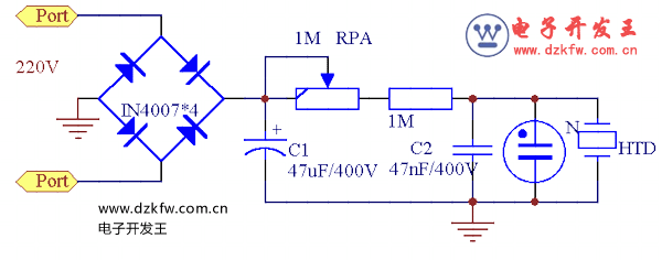 電路原理如圖,當電源插頭接入220V交流市電時,交流電經全橋整流向47UF電容充電。幾秒鐘以后,電容充滿電,拔下插頭即可使用。50UF電容儲存的電能做電源,經電位器PR及1M電阻向C2充電,當C2電壓達到一定值以后,氖泡導通發光,同時壓電陶瓷片HTD發聲。C2發電以后電壓下降,氖泡熄滅,HTD停止發聲,這是C2又開始充電,重復前述過程,于是氖泡及HTD斷續發光發聲,起到催眠作用。電路中的電位器RP可調節聲光頻率,以達到最佳催眠效果。