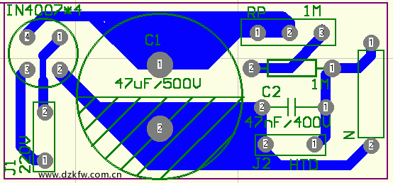 說明:印刷電路板中,J1接220交流電,J2接壓電陶瓷片,四支IN4007改成采用一支整流橋。
