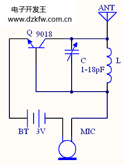 圖中的電感L用0.5mm的漆包線在直徑3mm的鉆頭上繞5圈,天線ANT用50厘米長的細(xì)導(dǎo)線就可以了。電容C選用1-18pF的可調(diào)電容,以方便調(diào)節(jié)發(fā)射頻率(也可以通過改變電感線圈的間距大小來進(jìn)行微調(diào)),使電路發(fā)射頻率在收音機(jī)的頻率范圍內(nèi)。這個(gè)電路經(jīng)過我的實(shí)際搭接,效果并不理想,畢竟過于簡易,只用一只三極管,這樣既作放大用,又作調(diào)制用,所以,指標(biāo)很差,傳播距離太近,聲音失真也比較嚴(yán)重。