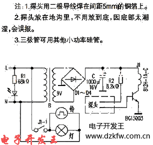 市電經變壓器日藕合到次級,經整流、濾波后,電容 C 二端產生 12V 的直流電壓。此電壓通過繼電器線圈加到三極管集電極上。三極管荃極電壓受水位探頭控制,探頭沒接觸到水時,電壓加不到基極上,三極管不導通繼電器不吸合,不會報帶。一旦蓄水池溢水,探頭浸泡在水里, RZ 上的電壓通過水的電阻,加到三極管的基極(偏置電阻= R2 +水阻)使三極管導通,繼電器J觸點J1-1吸合,開始報警。