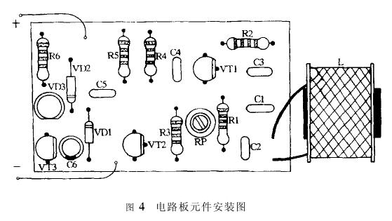 圖2是金屬探測器電原理圖,圖3是它的電路板安裝圖,圖4是它的電路板元件安裝圖。組裝前將所用元器件的管腳引線處理干凈并鍍上錫。對照三個圖,依次將電阻器、二極管、電容器、三極管、發(fā)光二極管、微調電阻器焊到電路板上,再將電感探頭、開關、電池夾連接到電路板上。電路裝好,檢查無誤就可以通電調試。接通電源,將微調電阻器RP的阻值由大到小慢慢調整,直到發(fā)光二極管亮為止。然后用一金屬物體接近電感探頭的磁心端面,這時發(fā)光二極管會熄滅。調整微調電阻器RP可以改變金屬探測器的靈敏度,微調電阻器RP的阻值過大或過小電路均不能工作。如果調整得好,電路的探測距離可達20mm。但要注意金屬探測器的電感探頭不要離元器件太近,在裝盒時不要使用金屬外殼。必要時也可以將金屬探測器的電感探頭引出,用非金屬材料固定它。