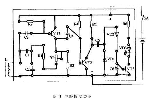 金屬探測器的振蕩頻率約為40KHz,主要由電感L 、電容器C1、C2決定。調節(jié)電位器RP減小反饋信號,使電路處在剛剛起振的狀態(tài)。電阻器R2是三極管VT1的基極偏置電阻。微弱的振蕩信號通過電容器C4、電阻器送到由三極管VT2、電阻器R4、R5及電容器C5等組成的電壓放大器進行放大。然后由二極管VD1和VD2進行整流,電容器C6進行濾波。整流濾波后的直流電壓使三極管VT3導通,它的集電極為低電平,發(fā)光二極管VD3亮。