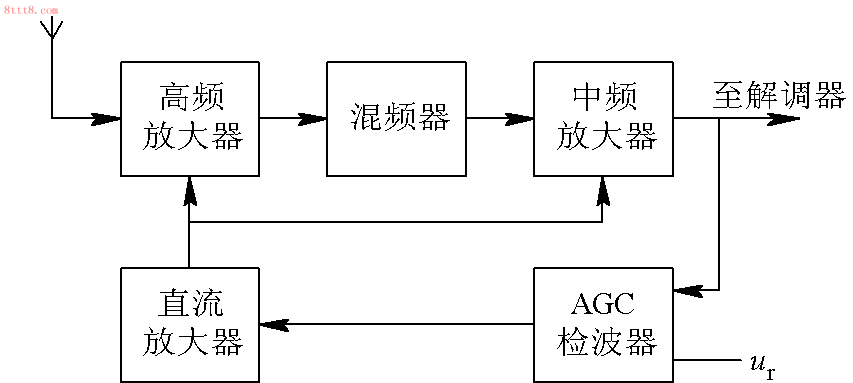 AGC電路的作用是,當(dāng)輸出信號電壓變化很大時,保持接收機輸出電壓幾乎不變.圖10-25是一個典型的具有AGC的接收機方框圖.其中,高頻放大器和中頻放大器是直接受控的增益可控的放大器.高頻放大器和中頻放大器是AGC控制環(huán)路的對象.檢波器,低通濾波器和直流放大器組成反饋控制器.