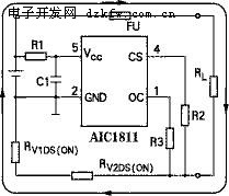 以放電電流過流保護(hù)為例,CS端為放電電流檢測端,它連續(xù)地檢測放電電流。這是利用CS端的電壓VCS與放電電流IL有一定關(guān)系,如圖3所示。如果把導(dǎo)通的V1、V2看做一個電阻,即RV1DS(ON)及RV2DS(ON),則放電回路如圖3的虛線所示。若忽略R2上極小的壓降,則VCS對地的電壓為: