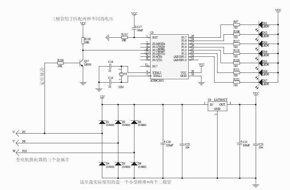 電路的供電和LED 的定位是本制作的一個難點。裝在電機上的電路始終在高速旋轉,我們就無法使用通常的方法來給電路供電。但我們可以通過對電機的改造來解決。我們都知道,一般的直流電機是線圈作為轉子,而永磁體作為定子的。他是通過電刷來實現給線圈供電的,而且直流電機的旋轉需要交變的電流,這是由固定在轉子軸上的換向器來巧妙的實現直流變為交流的。我們的電路是固定在電機的轉子上的,它和轉子是保持相對靜止的。因此,我們可以從電機的轉子中取得電源。方法很簡單,也就是從電機的換向器上用漆包線把電引到電路板上,經整流,濾波后給單片機電路供電。換向器上的每個電極什么時候變化,是和電機轉子的位子有關的,我們正好可以使用其中的一路信號來給LED 顯示的起始位置定位。