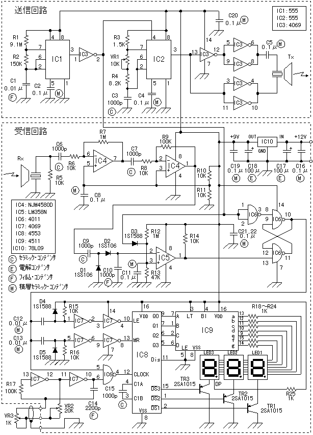 C15用于控制顯示部分的刷新頻率,當C15為1000pF時,刷新頻率為1100Hz,由IC9、LED1-LED3、TR1-TR3組成顯示電路。