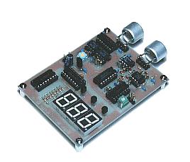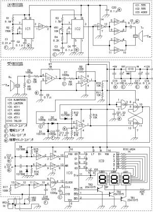 實際上,在不同環境溫度下時,我們只要測試標準距離1m,調節計數電路脈沖發生器的頻率(VR2和VR3),使其顯示為100即可。