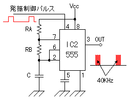 由兩塊555集成電路組成。IC1(555)組成超聲波脈沖信號發生器,工作周期計算公式如下,實際電路中由于元器件等誤差,會有一些差別。