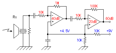 超聲波接收頭和IC4組成超聲波信號的檢測和放大。反射回來的超聲波信號經IC4的2級放大1000倍(60dB),第1級放大100倍(40dB),第2級放大10倍(20dB)。 由于一般的運算放大器需要正、負對稱電源,而該裝置電源用的是單電源(9V)供電,為保證其可靠工作,這里用R10和R11進行分壓,這時在IC4的同相端有4.5V的中點電壓,這樣可以保證放大的交流信號的質量,不至于產生信號失真。