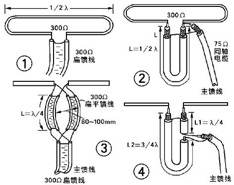 當饋線采用300Ω扁平饋線時,需進行阻抗變換,方法是用1/4波長的扁平饋線兩根制成阻抗變換器,接法如圖3所示。