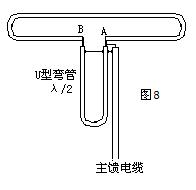 λ/2平衡變換器又叫U型平衡變換器,如圖8所示,折合半波振子天線(輸入阻抗為300歐)與會75歐的同軸線連接時,二者阻抗不匹配,因此必須在它們之間加裝U型平衡變換器。從圖8可看出,饋電點A和B的對地阻抗為300/2=150歐,信號從主饋電纜傳至A點分成兩路,分別供給振子左右兩邊的負載。由于A、B兩饋電點的波程差為λ/2。因此,A、B兩饋電點的電源大小相等,方向相反,從而達到了平衡變換的目的。
