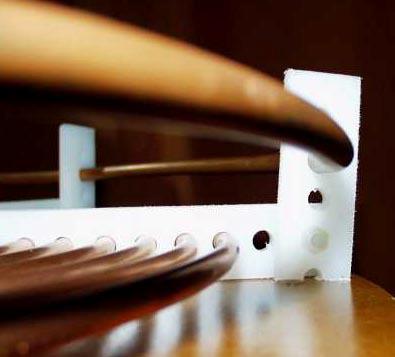 這樣盤成的主線圈可以適用于6英寸到8英寸的次極線圈(盤銅管很費時間,也滿費勁,但是不要圖快,要盡可能盤的圓滑.),還需要5毫米厚的軟塑料板(非脆性塑料)做主線圈支架,將其按等距離打眼(要打成9毫米的眼,要不穿不進去) 底座選用普通中密度板就可以了,這個底座還有用,將來底下要放其它東西.也盡可能加工好,接下來把銅管和塑料支架穿起來。