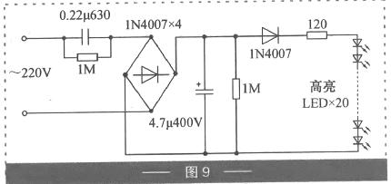 可以看出所有LED采用串聯方式連接,PCB板非焊接面最好具有反光層。隨后將3個電阻和1個高壓電容,以及原電子鎮流器的1個電解電容和5個二極管,按照圖9所示電路,在原電子鎮流器線路板上合理布置并焊好,作為新LED燈頭的供電板。