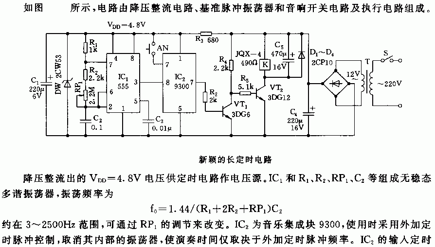 下圖是555芯片組成的長定時電路,定時電路由降壓整流,基準脈沖振蕩器和開關電路及執行電路組成.
