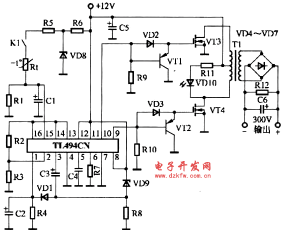 電路如圖1所示。該電路核心器件是脈寬調制控制芯片TL494CN,它是— 個開關振蕩和穩壓控制的集成電路。其9腳、10腳輸出相位相反的開關脈沖。分別控制VT1~VT4。當10腳為正脈沖時,VT1截止、VT3導通,VT2導通、VT4截止。9腳為正脈沖時,VT2截止、VT4導通。在變壓器的次級產生了被升高的高頻電壓,再經橋式整流、濾波變成約300V的直流高壓輸出。集成電路TL494CN的1腳、16腳和2腳、15腳分別是該集成電路內部兩個比較器的同相輸入端和反相輸入端。利用這兩個比較器實現該電路的超溫保護和過壓保護。