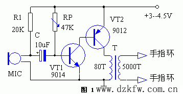 話筒MIC選用普通駐極體電容話筒,T采用便攜式收音機輸出變壓器鐵芯繞制,初級用Φ0.15mm漆包線繞80匝,次級用Φ0.08mm漆包線繞5000匝。RP為47k帶開關的電位器。電源采用二節5號電池。電極用厚0.5-1mm左右的銅片焊上兩根細絕緣導線,并將銅片彎成指環套在不相鄰的兩手指上。