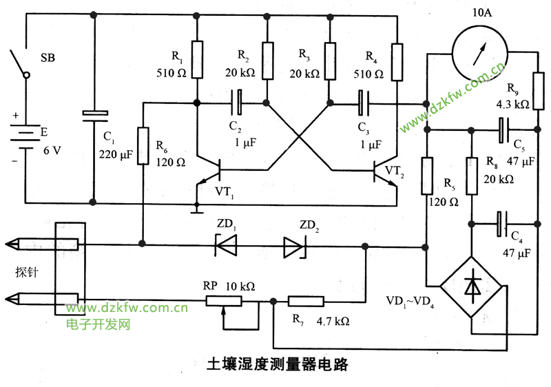 該電路由VT1、VT2,電容C2、C3,電阻R1、R2、R3、R4等共同組成了一個振蕩電路。振蕩頻率由R6來進行控制,R6一端接在探針的一根引線上,探針插入土壤里。隨著土壤水分的變化,在探針上的電阻值也在發生著顯著的變化,這個變化傳導給R6時,將使振蕩電路的振蕩頻率發生變化。頻率變化可通過連接在VT2集電極的電流表的擺幅顯示出來,人們再根據這個表針的擺幅刻度來判斷濕度的大小。