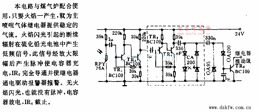 本電路與煤氣爐配合使用,只要火焰一產生,就為主噴咀氣體繼電器提高穩定的氣流。