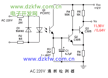 兩只三極管組成施密特觸發器電路,當有AC 220V 輸入時,監測輸出端輸出高電平,沒有交流輸入時輸出低電平。