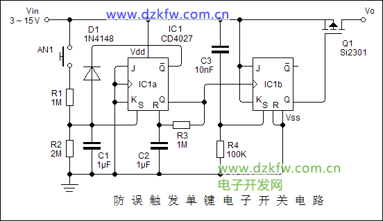 電路也可以用JK觸發(fā)器,下面是使用CD4027 的單按鍵防誤觸發(fā)電子開(kāi)關(guān):