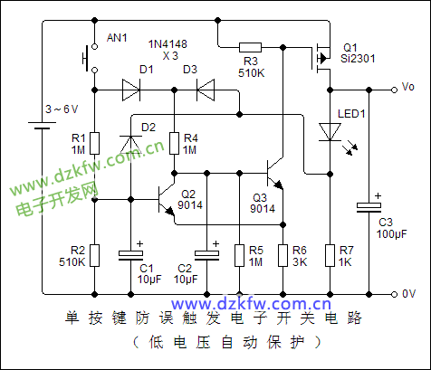單按鍵防誤觸發(fā)電子開(kāi)關(guān)電路: