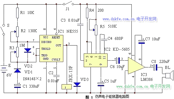 合上電源開關S,IC1便通電工作,在IC1的輸出端③腳上不斷有脈沖輸出。有脈沖時,繼電器J勵磁吸合,其常開觸點J1接通,使后級電路獲得電源而工作,發生貓叫聲,每觸發一次IC2,就有一聲貓叫輸出,經IC3功率放大后,推動揚聲器BL發出宏亮逼真的聲音。使老鼠們聞聲喪膽,達到驅鼠的目的。