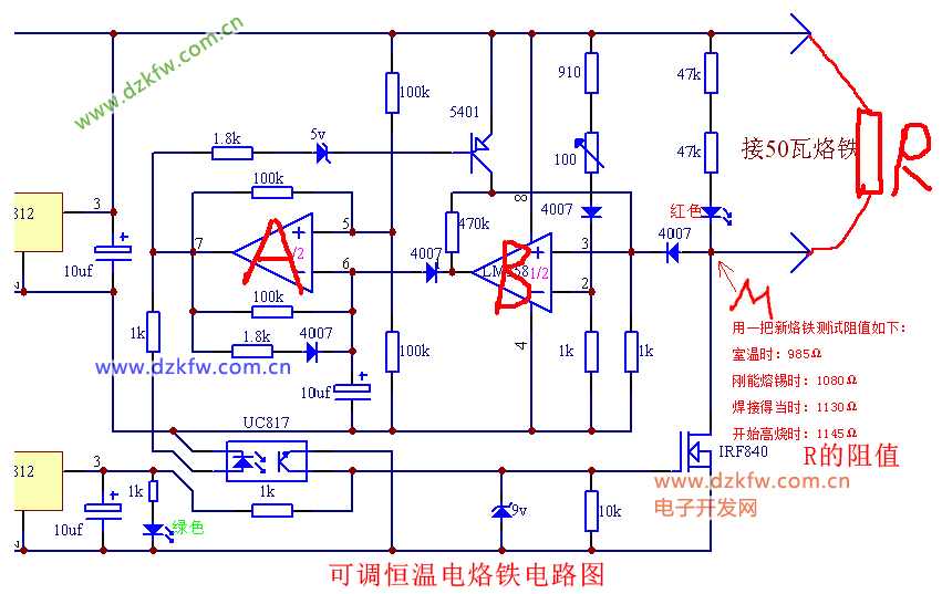 上電后A運放6腳由于10uf電容的存在電位比5腳低,所以A運放輸出為高電平,UC817光耦導通---IRF840為截止,M點處于懸空態(tài)。由于烙鐵溫度不高也就是烙鐵R阻值比較小,B運放3腳電位(由烙鐵內(nèi)阻R串接4007與1k電阻所得分壓)高于2腳電位(由910Ω、100串接4007與1k電阻所得分壓)輸出為高電平,B輸出所接4007處于反向截止狀態(tài)所以A運放不受B的影響。