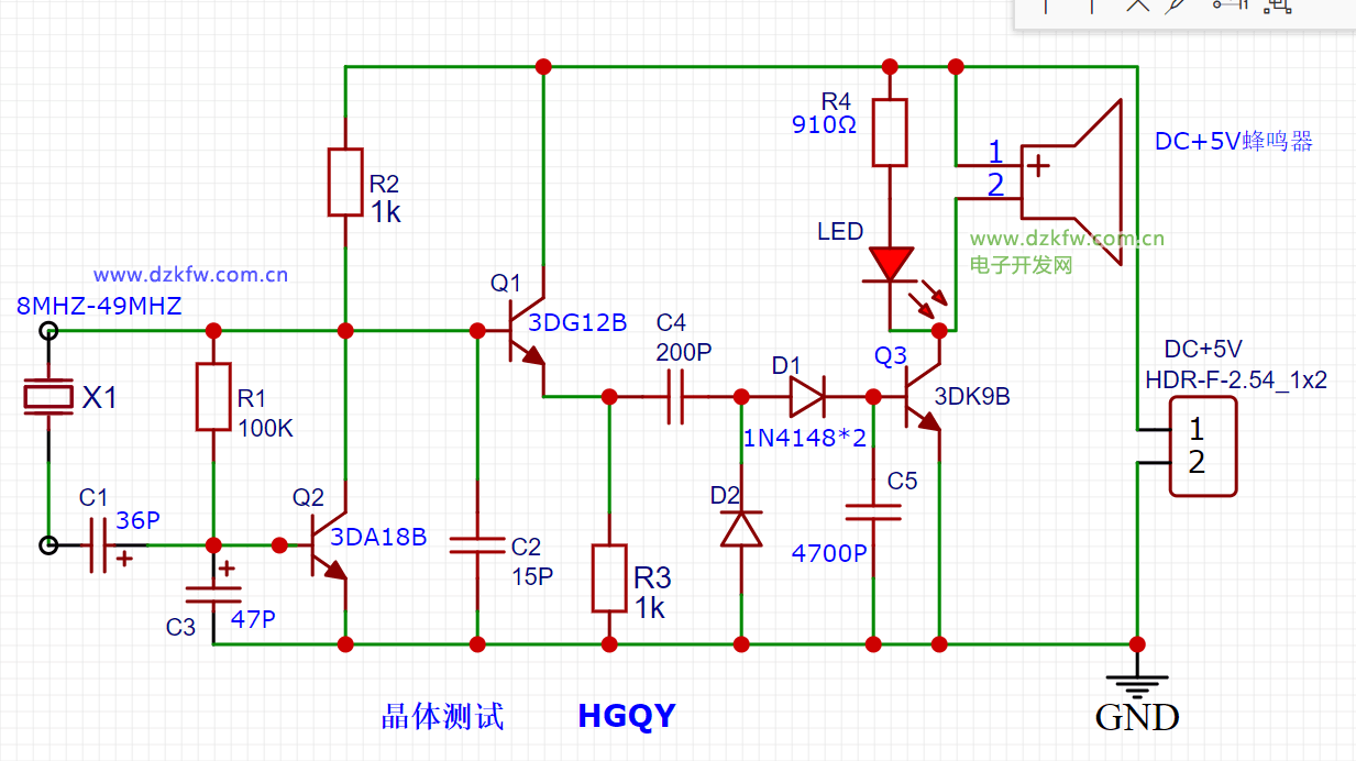 晶振測試小電路,電路用分立元件,制作簡單,晶體完好時,聲光一起出現。就是32768HZ沒反應。2023年05月20日18點27分