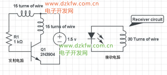3)制作接收電路:很簡(jiǎn)單,參照電路圖將無抽頭線圈的兩端焊接至發(fā)光二極管兩端即可。