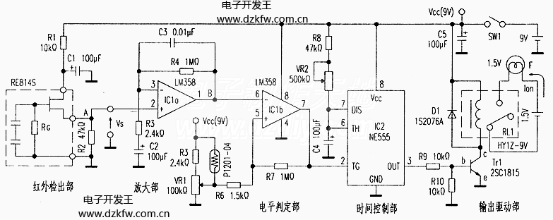 這款夜間照明電路使用了熱釋電紅外傳感器和照度傳感器。用熱釋電紅外傳感器檢測數米范圍內移動的人體.發出開啟照明燈光的控制信號。用照度傳感器檢測外界光線.使照明燈只在黑暗或夜晚時開啟.白天不亮。采用定時器使燈泡照明的時間被控制在定時范圍內。