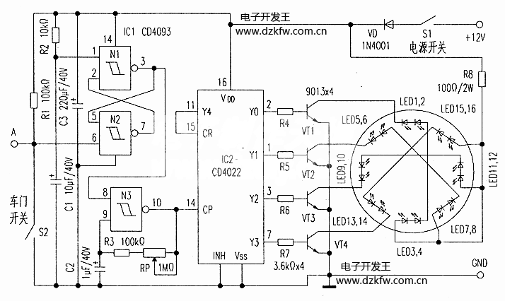 原理電路如附圖所示,其中+12V端接救護車電瓶正極(12V)、GND接搭鐵線,A端接門開關。在救護車關好車門前,門控開關S2是斷開的。關上車門后.S2被聯動閉合.這時如果合上電源開關S1,則N1、N2組成的雙穩態觸發器③腳就輸出高電平,并送到振蕩器N3⑧腳使其處于工作狀態。其振蕩頻率由C2、R3、RP時間常數決定.由RP進行調整,控制信號燈發光旋轉速度。振蕩信號送至譯碼輸出8進制計數器IC2(CD4022)的CP端,作時鐘控制信號.使其Y0~Y3依次輸出正脈沖,VT1~VT4輪流導通,LED1~LED16順次發光.形成藍色旋轉光環。每組LED都分成兩段、兩段同時發光.發光順序為: