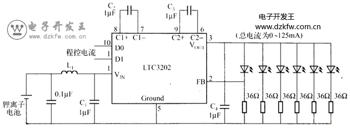 LTC3202是Linear TECHNOLOGY公司生產的不需要門控振蕩器的電荷泵,圖為采用LTC3202電荷泵的鋰離子電池供電驅動白光LED電路。為了克服噪聲問題,LTC3202使用了線性調控技術,以確保轉換電容的充電和放電電量正好滿足負載電流的需要,且使在每個時鐘周期內都能保持一個常量,從而確保它們無法產生音頻分量。