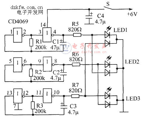 如圖所示為一種有趣的小玩具電路。合上電源開關后,3只小彩燈會隨機發出紅、綠、橙色。電路主要由六反相器CD4069數字集成電路與3只變色發光二極管等元器件構成。