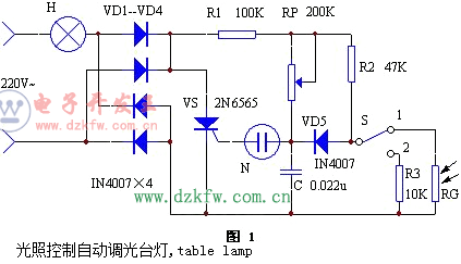 當S撥向位置1時,光敏電阻RG取代R3,當周圍光線較弱時,RG呈現高電阻,VD5右端電位升高,電容C充電速率加快,振蕩頻率變高,VS導通角增大,電燈兩端電壓升高、高度增大。當周圍光線增強時,RG電阻變小,與上述相反,電燈兩端電壓變低,高度減小。