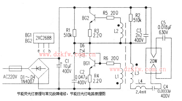 如圖所示,三極管電子鎮(zhèn)流器由整流電路、高頻發(fā)生器及高頻電抗器三部分組成。4只耐壓400V的二極管組成橋式整流電路,C1是濾波電容,高頻發(fā)生器由兩只耐壓400V以上的三極管BG1和BG2及互感線圈L1、L2、L3等組成。互感線圈的黑點是同名端。L1與BG1及L2與BG2的接線方向正好相反;這樣才能保證兩只三極管交替工作(不允許同時導通)。L4是高頻電感線圈,用來限制燈管的電流(鎮(zhèn)流器),C4是隔直電容。