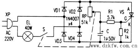 電路如圖所示,由電源插頭XP、白熾燈泡EL、電源開關S、整流二極管VD1~VD4、單相可控硅VS與電源構成主電路;由調光電位器RP、電容C、電阻R1與R2構成觸發電路。將XP插入市電插座,閉合S,接通220V交流電源,VD1~VD4全橋整流得到脈動直流電壓加至RP,調節RP的阻值,就能改變C的充/放電時間常數,即改變VS控制觸發角,從而改變VS的導通程度,使EL獲得0~220V電壓。RP的阻值調得越大,則EL越暗,反之越亮,達到無級調光的目的。